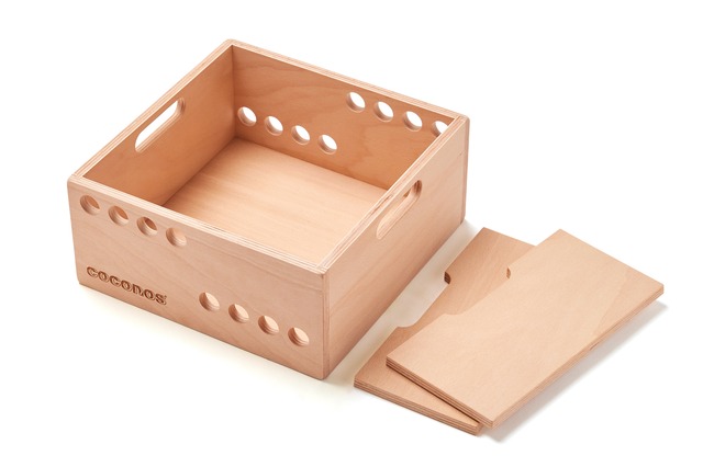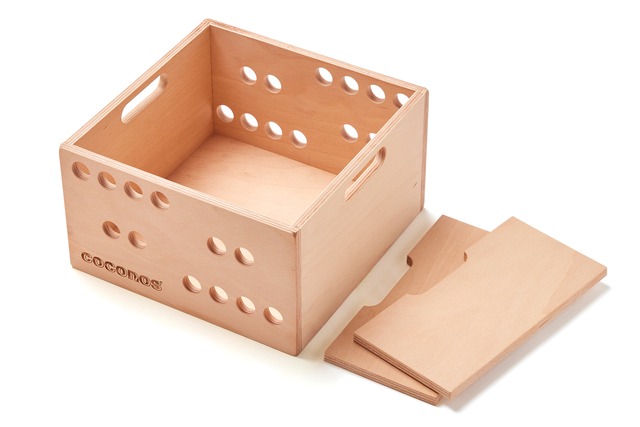 coconos4に付属している専用木箱です。256マス分のパーツを収納することができます。例えば、coconos2と、拡張セットを2種類を収納することができます。ひっくり返して遊ぶ際には、5段分の高さとぴったり合うようになっています。 また、haco2,haco3に比べて穴の数が多いので、木箱の中に道を組み込む『片付けミッション』の幅が広がり、自由度の高い遊びを創造することができます。 【商品情報】 内容 木箱1つ、板2枚 素材 ブナ合板 サイズ 26x26x15cm(外寸) 重量 約2.0kg メーカー coconos(日本)