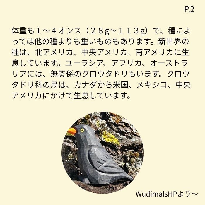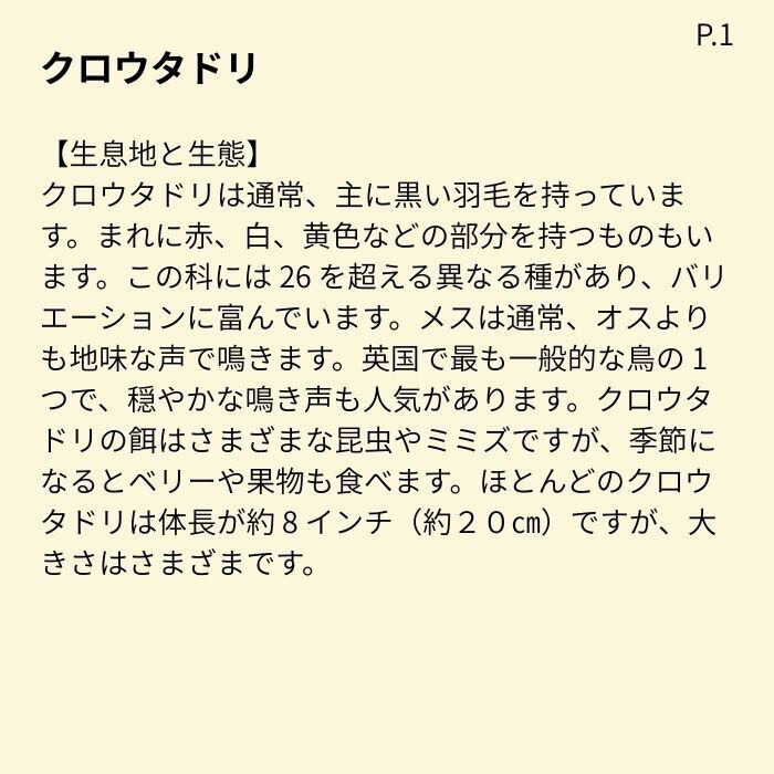 クロウタドリは通常、主に黒い羽毛を持っています。まれに赤、白、黄色などの部分を持つものもいます。この科には 26 を超える異なる種があり、バリエーションに富んでいます。メスは通常、オスよりも地味な声で鳴きます。英国で最も一般的な鳥の 1 つで、穏やかな鳴き声も人気があります。クロウタドリの餌はさまざまな昆虫やミミズですが、季節になるとベリーや果物も食べます。ほとんどのクロウタドリは体長が約 8 インチ(約20㎝)ですが、大きさはさまざまです。体重も 1 〜 4 オンス(28g〜113g)で、種によっては他の種よりも重いものもあります。新世界の種は、北アメリカ、中央アメリカ、南アメリカに生息しています。ユーラシア、アフリカ、オーストラリアには、無関係のクロウタドリもいます。クロウタドリ科の鳥は、カナダから米国、メキシコ、中央アメリカにかけて生息しています。