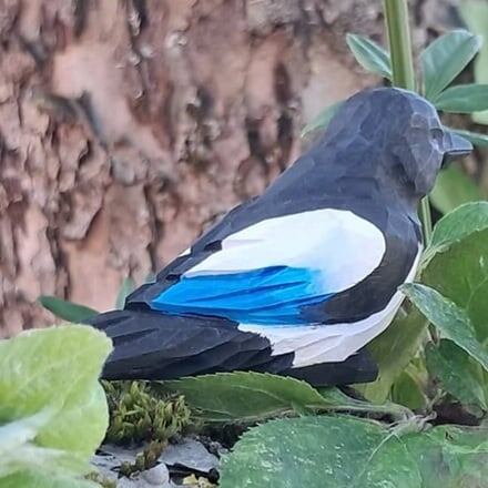 カラスの一種で、カラスより一回り小さな鳥です。頭から腹にかけてはカラスのように黒く、腹は白く尾は濃い青から青緑への美しいグラデーションになっています。近くで見ると、黒い羽毛に青い光沢があるのがわかります。体重は最大250gほどになり、昆虫類や種子、穀物などなんでも食べ、農耕地ではイナゴを食べることから益鳥として大切にされてきました。8m以上の高さの木の上や電柱などに営巣して繁殖します。また、カササギは非常に高い知能を持っており、ミラーテストをクリアした初めての鳥類でもあります。