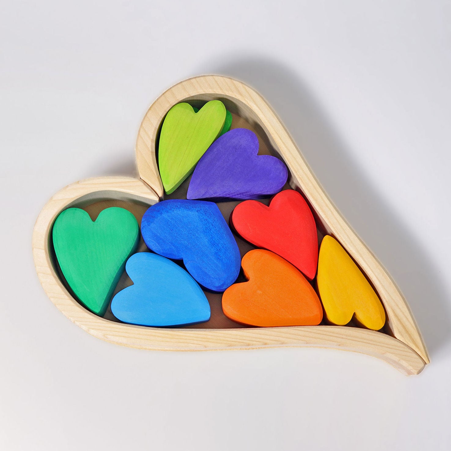 ・花びらのようなハートの積木。まず、そのキュートさに思わず手が伸びます。丸みのあるフォルムは、手にしっくりとなじむので、つかみやすく、小さい子とハートのやりとりも楽しそうです。枠は3つに分かれるので、枠も一緒にに使っての遊びは他にはない面白さです。