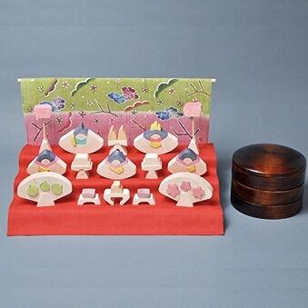 ・一段目は親王、姫、ぼんぼりに三方徳利、二段目は三人官女、高杯、三段目には桜、橘、膳が配してあります。