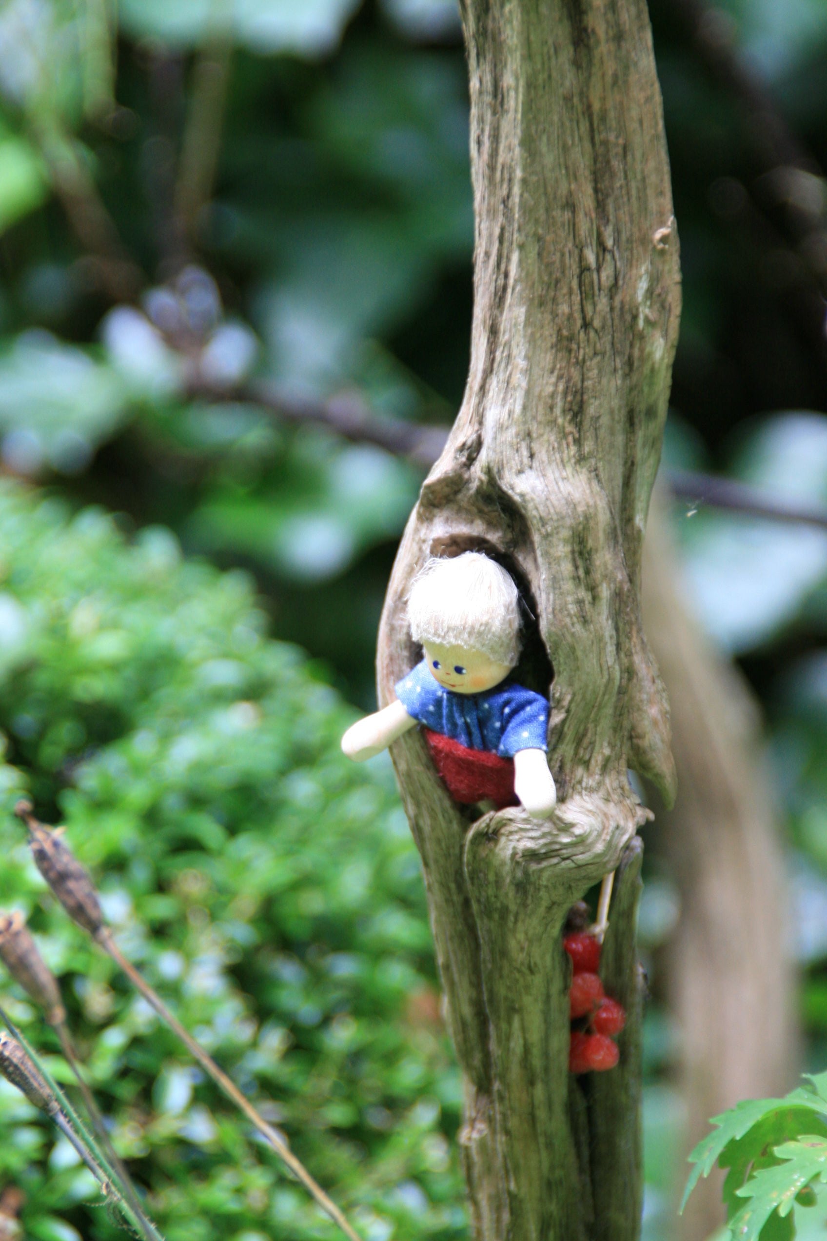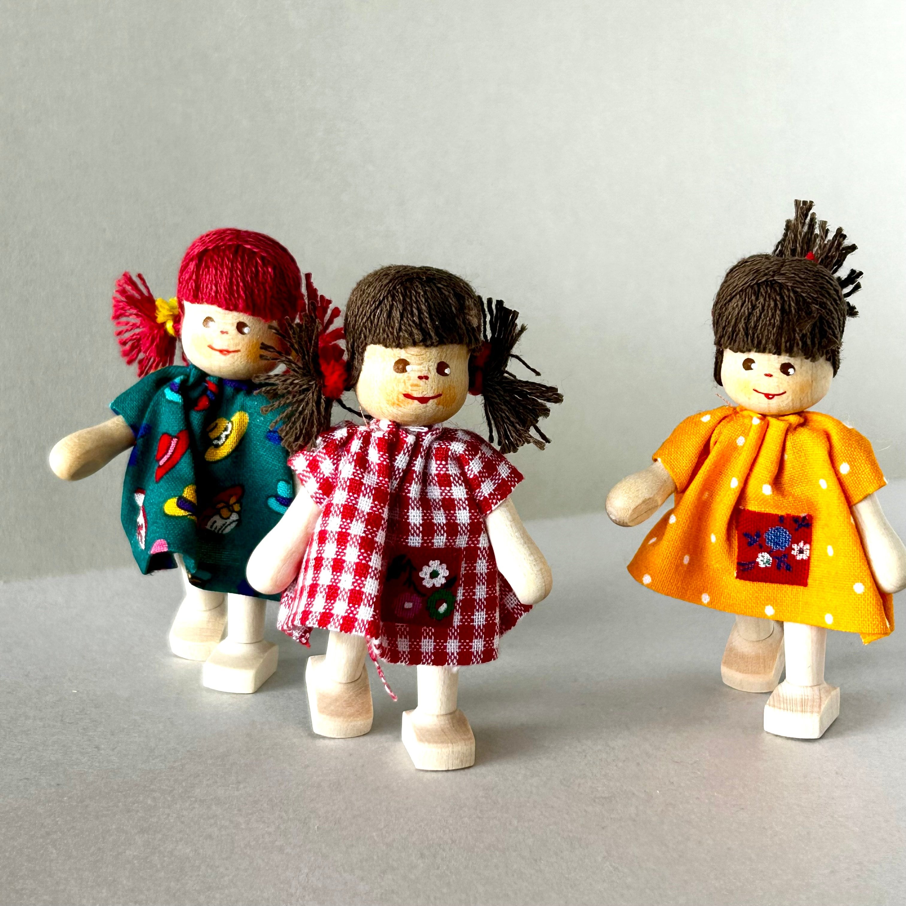 ・この人形の大きな特徴は、手足がゴムでつないであるので、自由に動かして遊ぶことができること。立ってみたり、座ってみたり、さらに人形に表情が生れます。