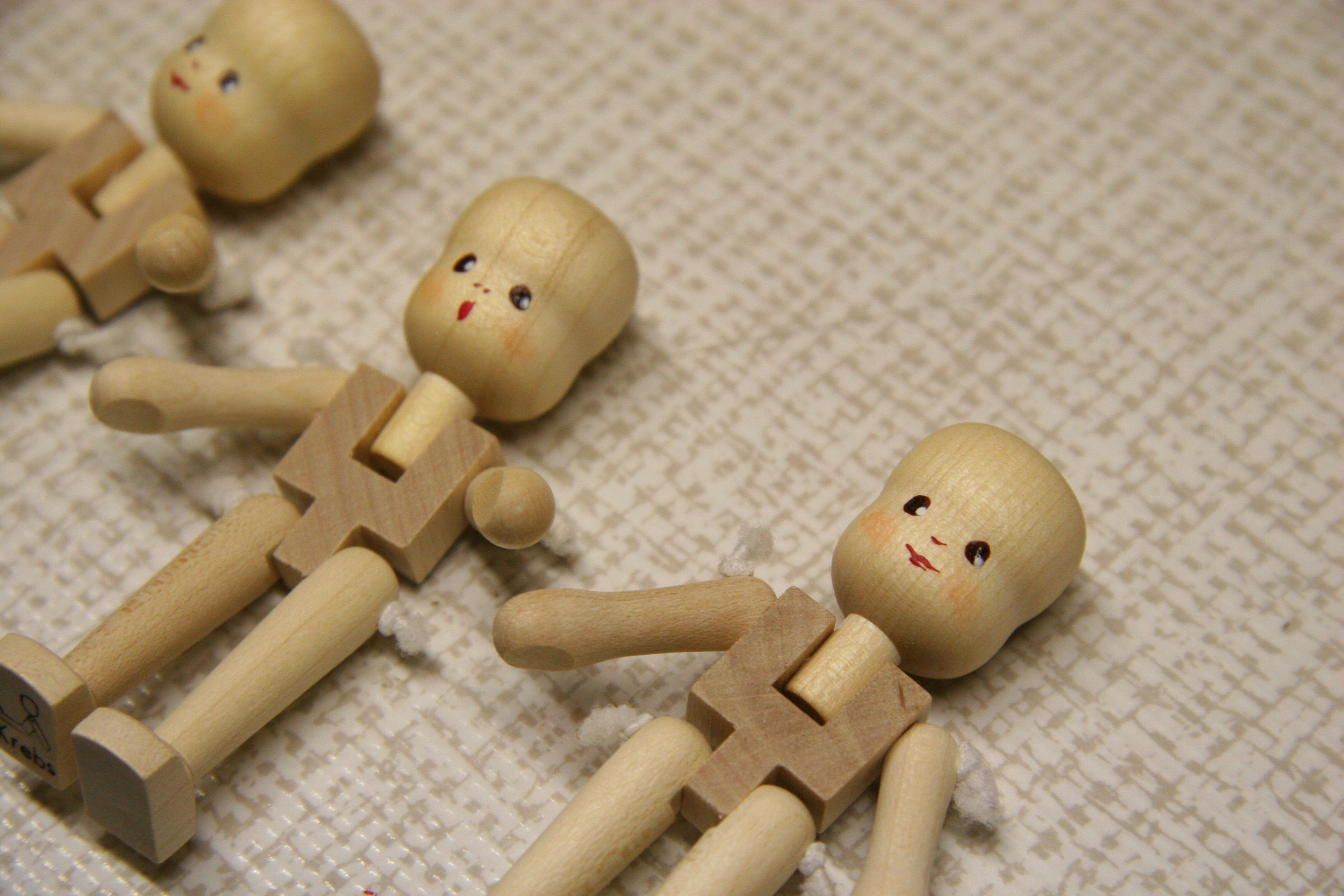 ・この人形の大きな特徴は、手足がゴムでつないであるので、自由に動かして遊ぶことができること。立ってみたり、座ってみたり、さらに人形に表情が生れます。