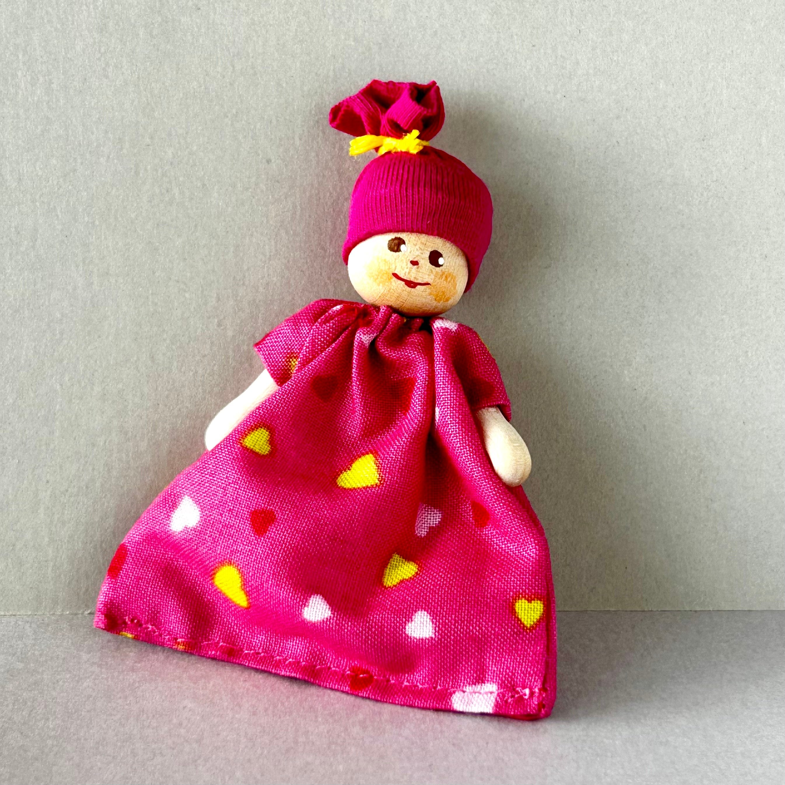 ・この人形の大きな特徴は、手足がゴムでつないであるので、自由に動かして遊ぶことができること。立ってみたり、座ってみたり、さらに人形に表情が生れます。