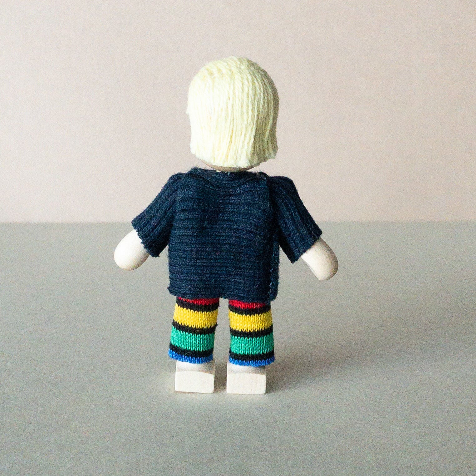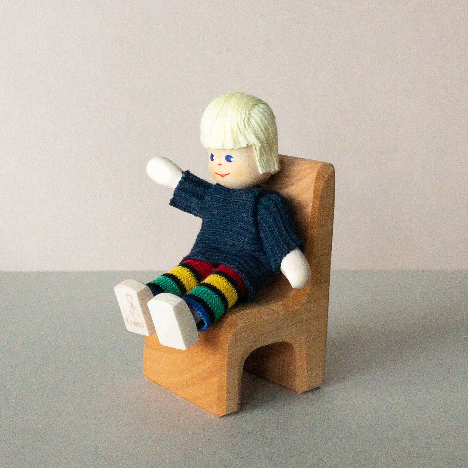 ・この人形の大きな特徴は、手足がゴムでつないであるので、自由に動かして遊ぶことができること。立ってみたり、座ってみたり、さらに人形に表情が生れます。