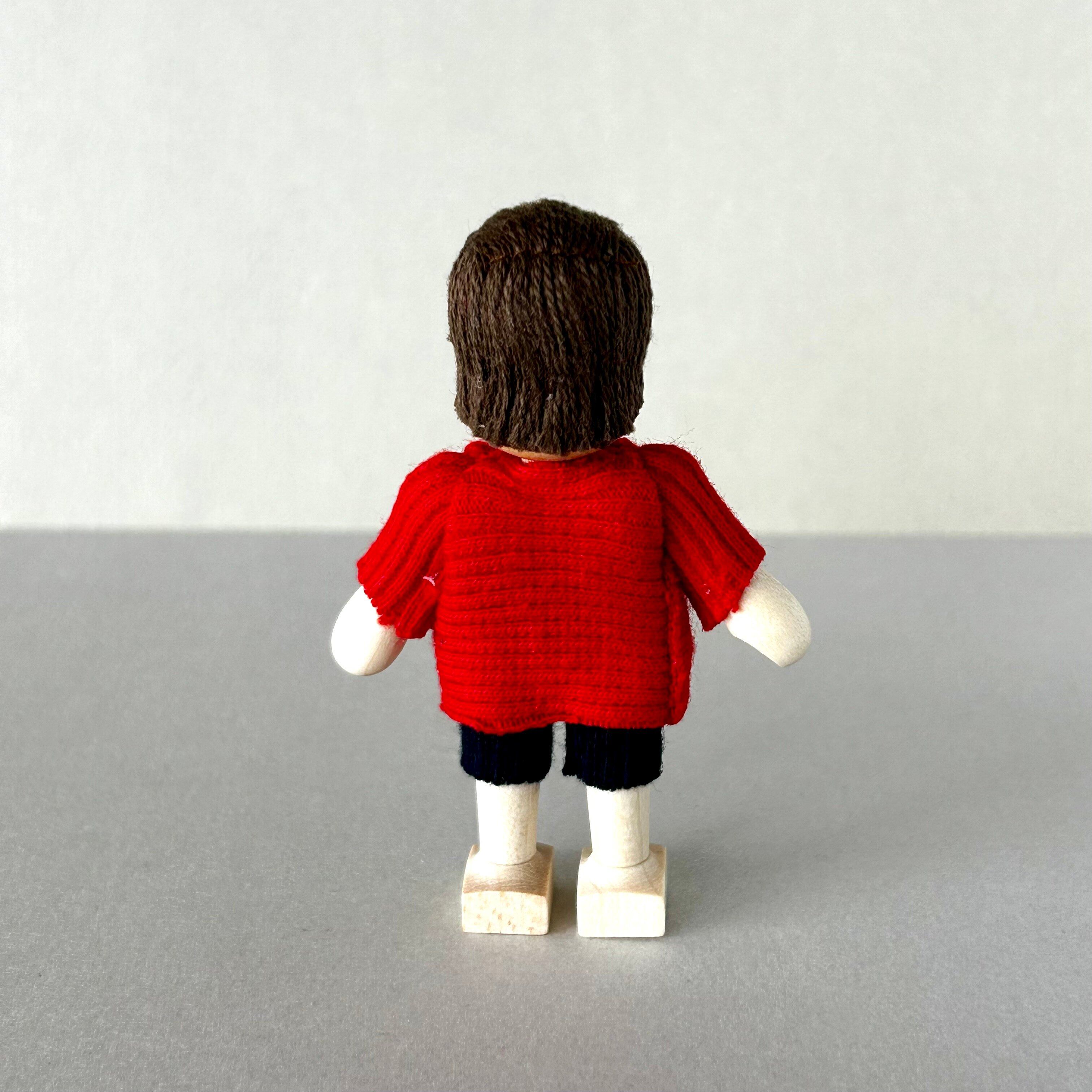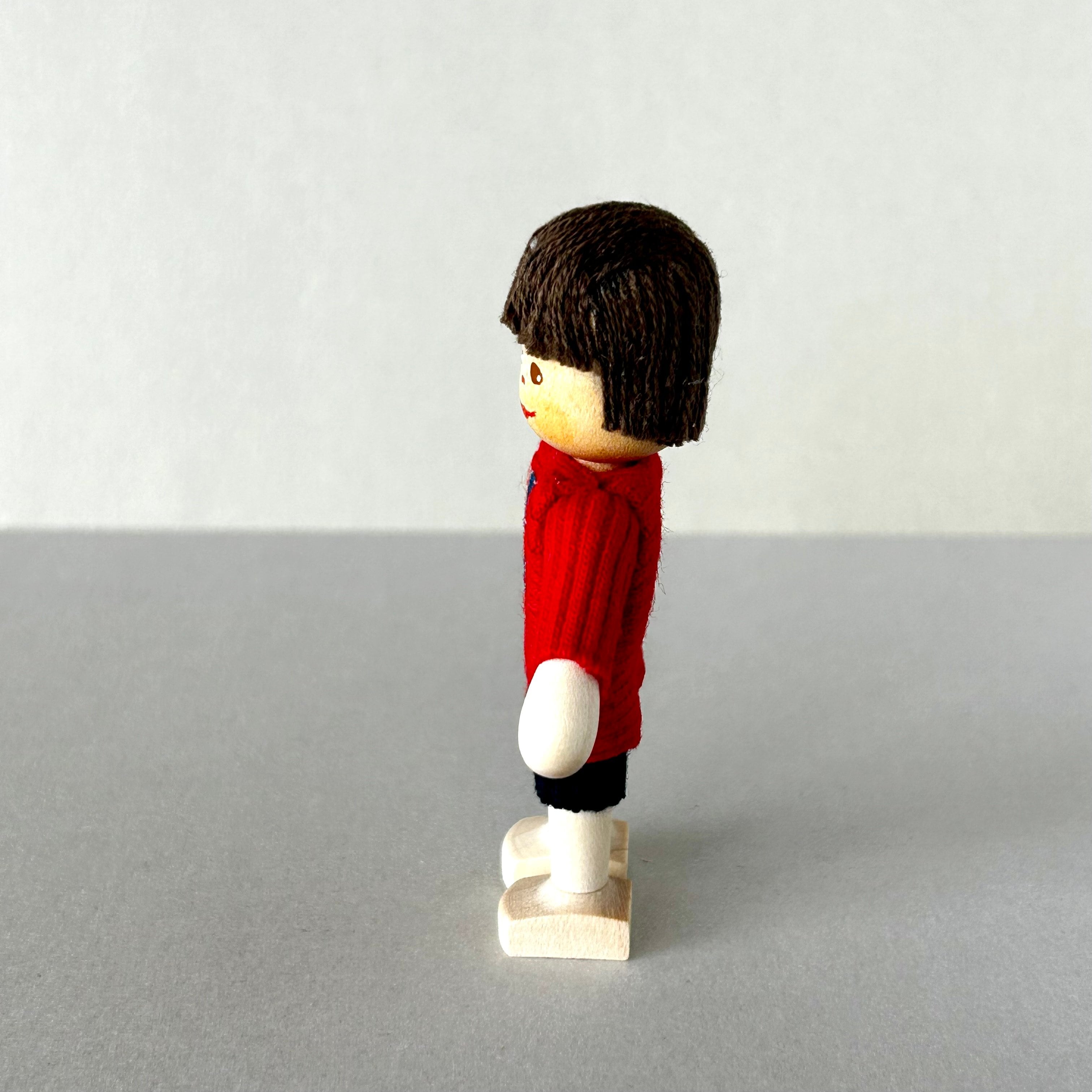 ・この人形の大きな特徴は、手足がゴムでつないであるので、自由に動かして遊ぶことができること。立ってみたり、座ってみたり、さらに人形に表情が生れます。
