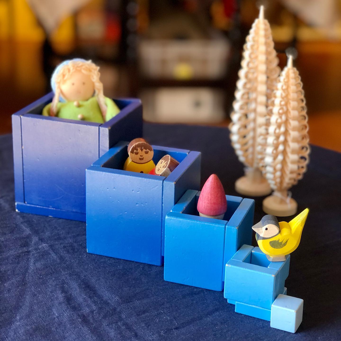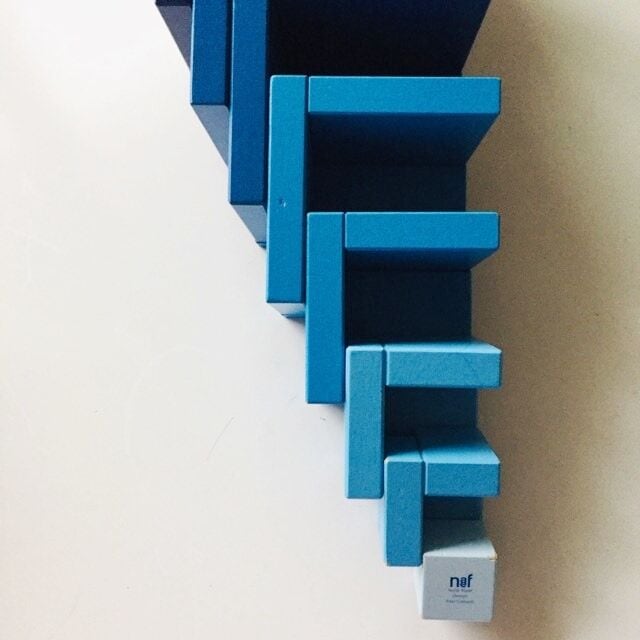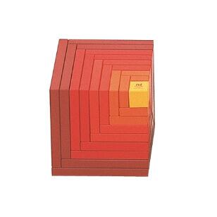 ・10㎝角の立方体を8個のパーツに分割し、入れ子のようにした構造と、5色のグラデーションが美しい積木です。ペア・クラーセンのデザイン。