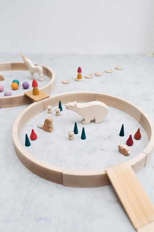 ファンタジーの世界を創ったり、バランスゲームやまんだら模様づくりなどの遊びができます。また、他の積み木と組み合わせて遊びやすく、その遊びかたは無限大です。