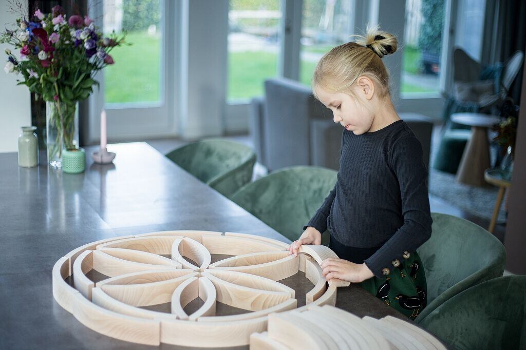 ファンタジーの世界を創ったり、バランスゲームやまんだら模様づくりなどの遊びができます。また、他の積み木と組み合わせて遊びやすく、その遊びかたは無限大です。