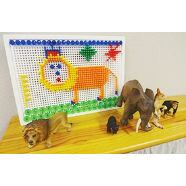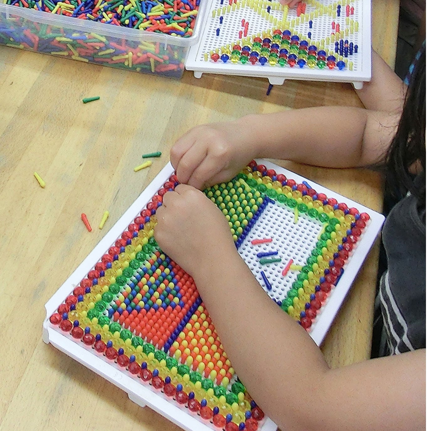 ・色とりどりのステッキを穴に差し込んで絵模様を作る遊びです。年齢やその子どもの遊び方は変化していくので、必要なステッキの大きさや使う量、ボードのサイズを調整してあげて下さい。