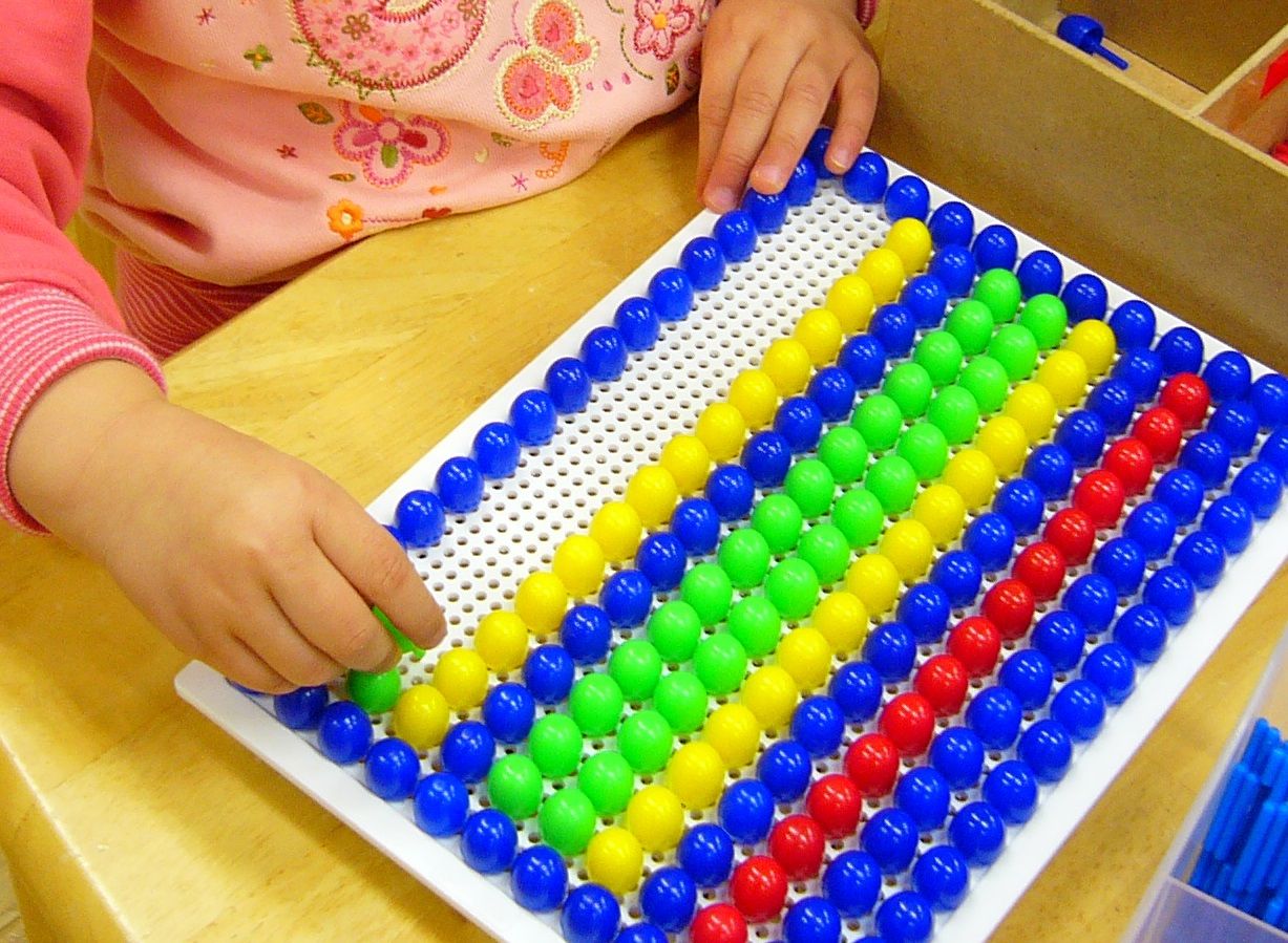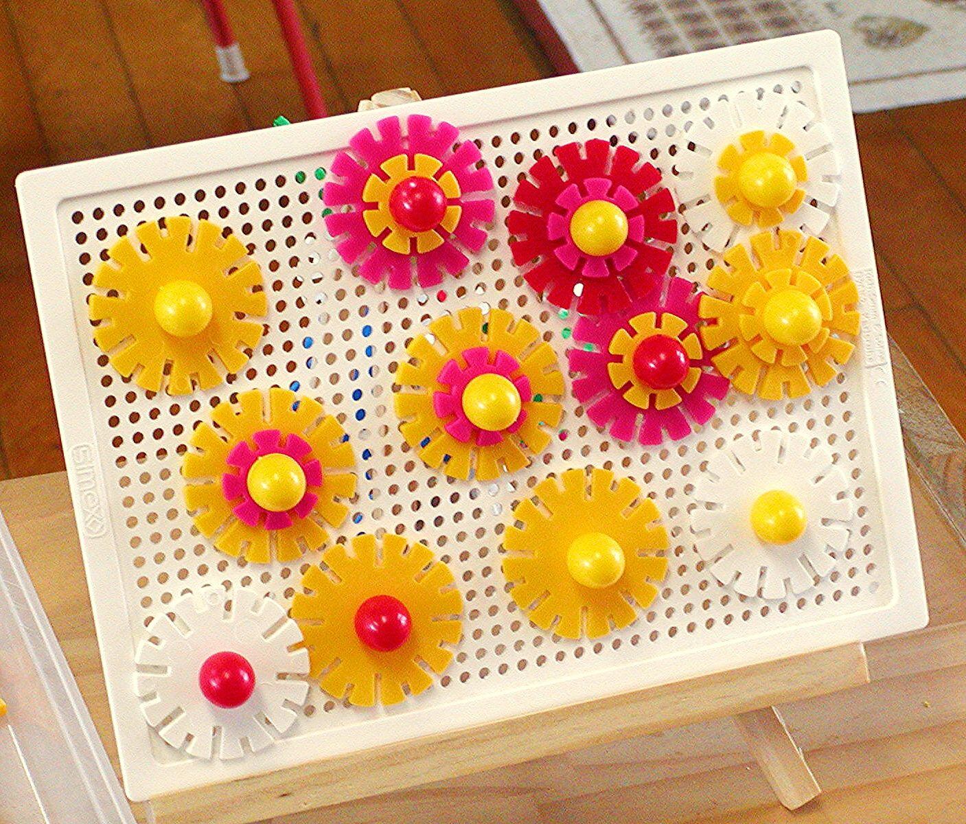 ・色とりどりのステッキを穴に差し込んで絵模様を作る遊びです。年齢やその子どもの遊び方は変化していくので、必要なステッキの大きさや使う量、ボードのサイズを調整してあげて下さい。