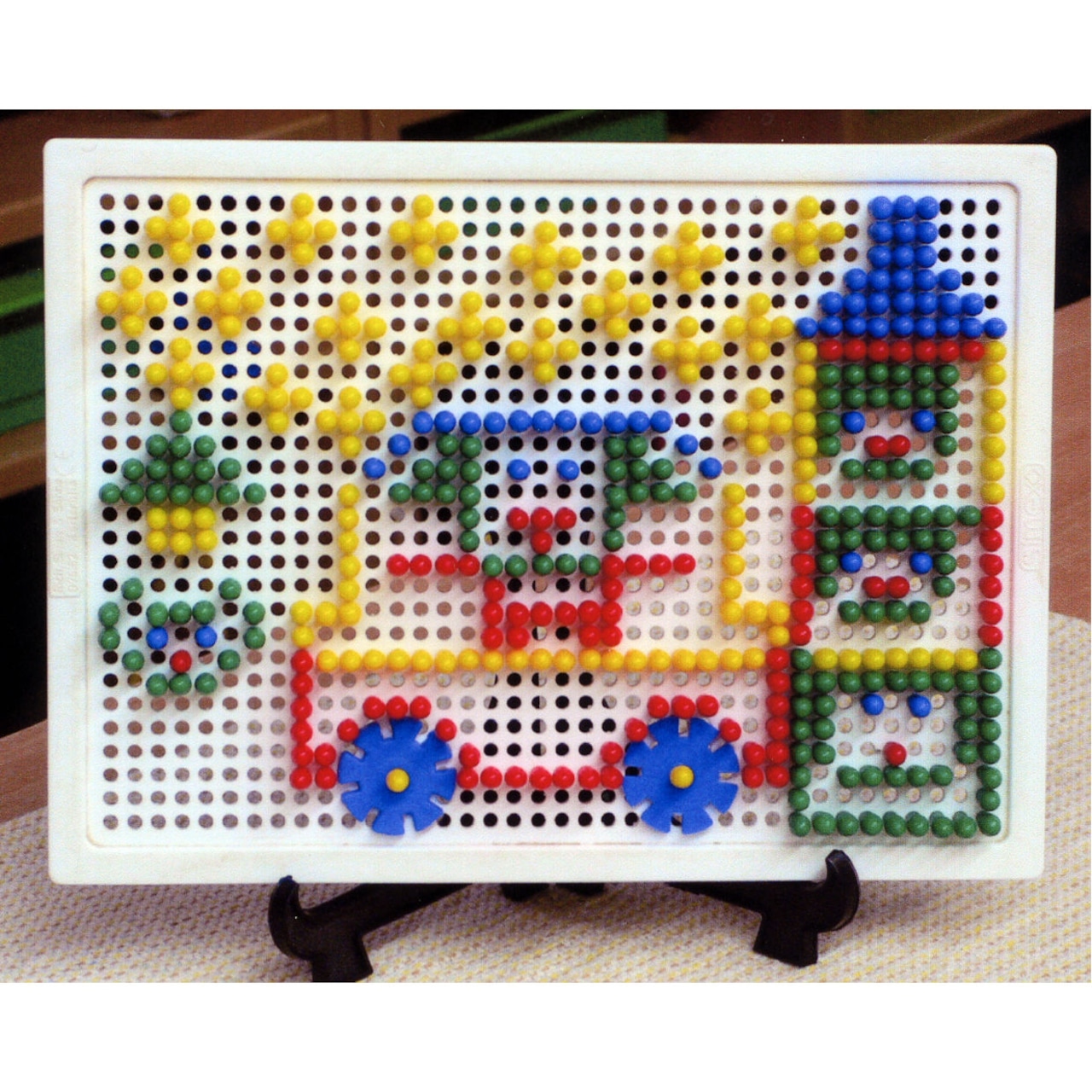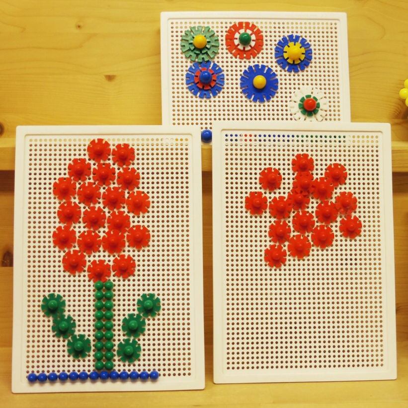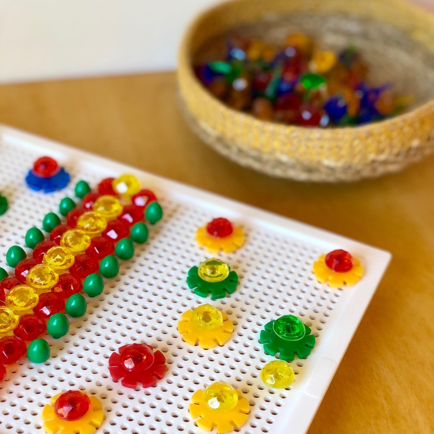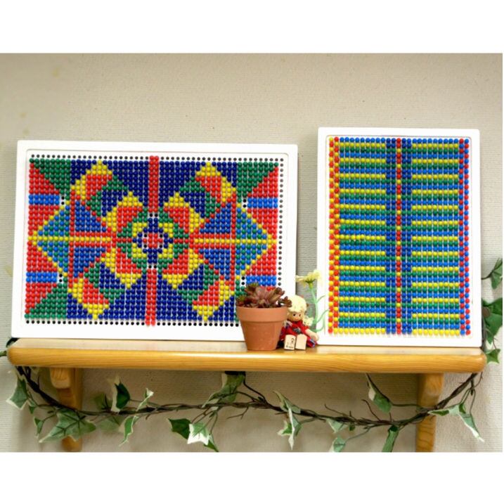 ・色とりどりのステッキを穴に差し込んで絵模様を作る遊びです。年齢やその子どもの遊び方は変化していくので、必要なステッキの大きさや使う量、ボードのサイズを調整してあげて下さい。