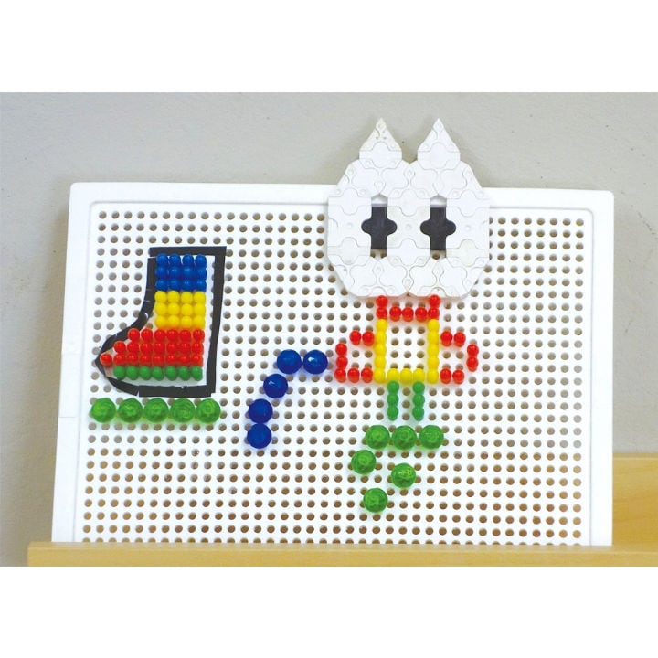 ・色とりどりのステッキを穴に差し込んで絵模様を作る遊びです。年齢やその子どもの遊び方は変化していくので、必要なステッキの大きさや使う量、ボードのサイズを調整してあげて下さい。