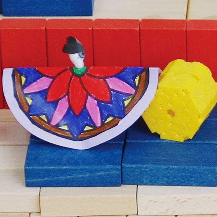 ・塗った後は、余白を切り落とし、ラミネートやブッカーで透明コーティングをすれば保管がしやすく、ひもを付けて天井から吊せば部屋の装飾になります。他のおもちゃと組み合わせると、デザインを更に楽しむあそびにもなります。