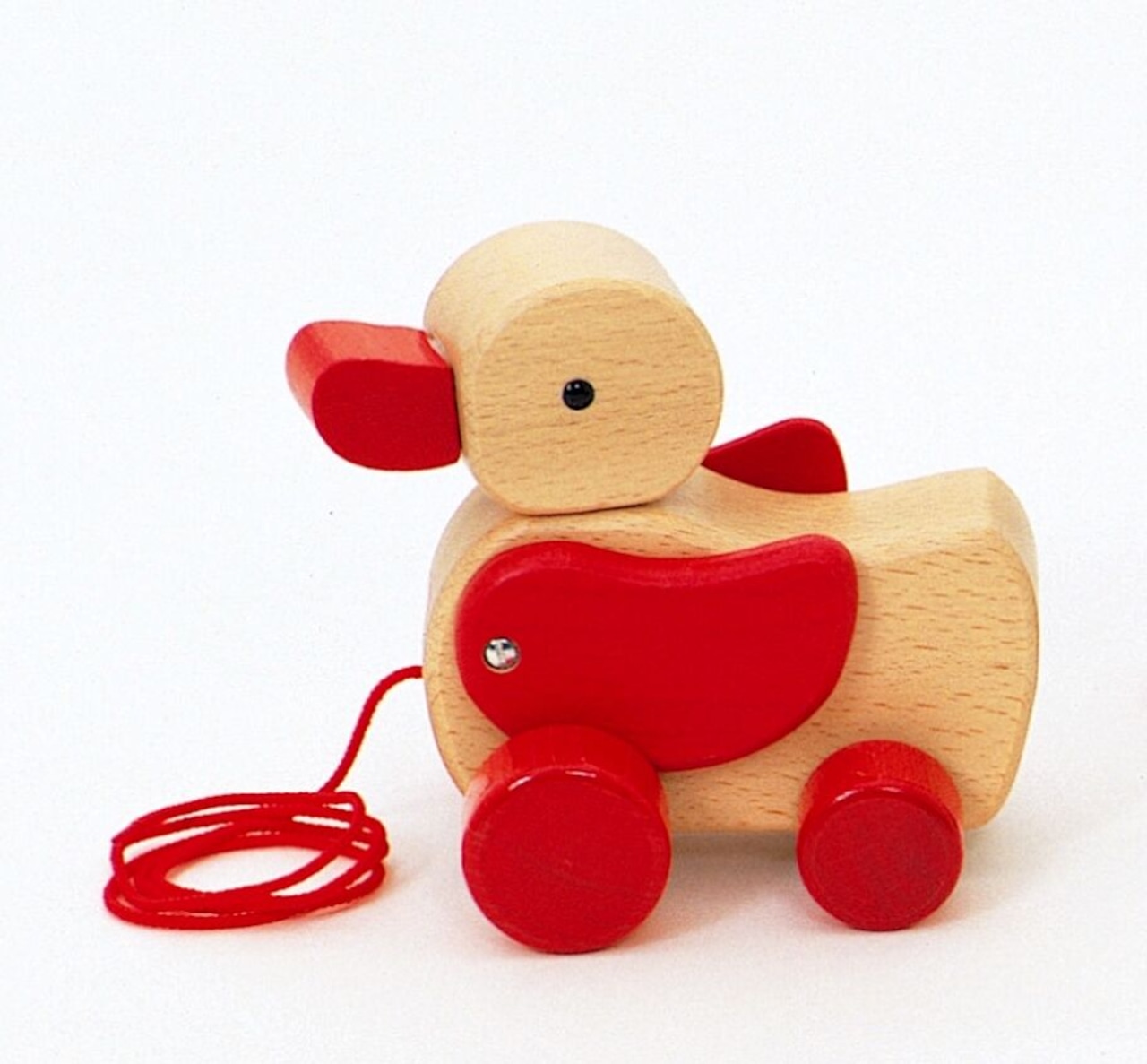 ・小さい目が可愛いあひるのプルトーイは、厚い無垢のブナ材を使用していて、引き応えある重さです。
