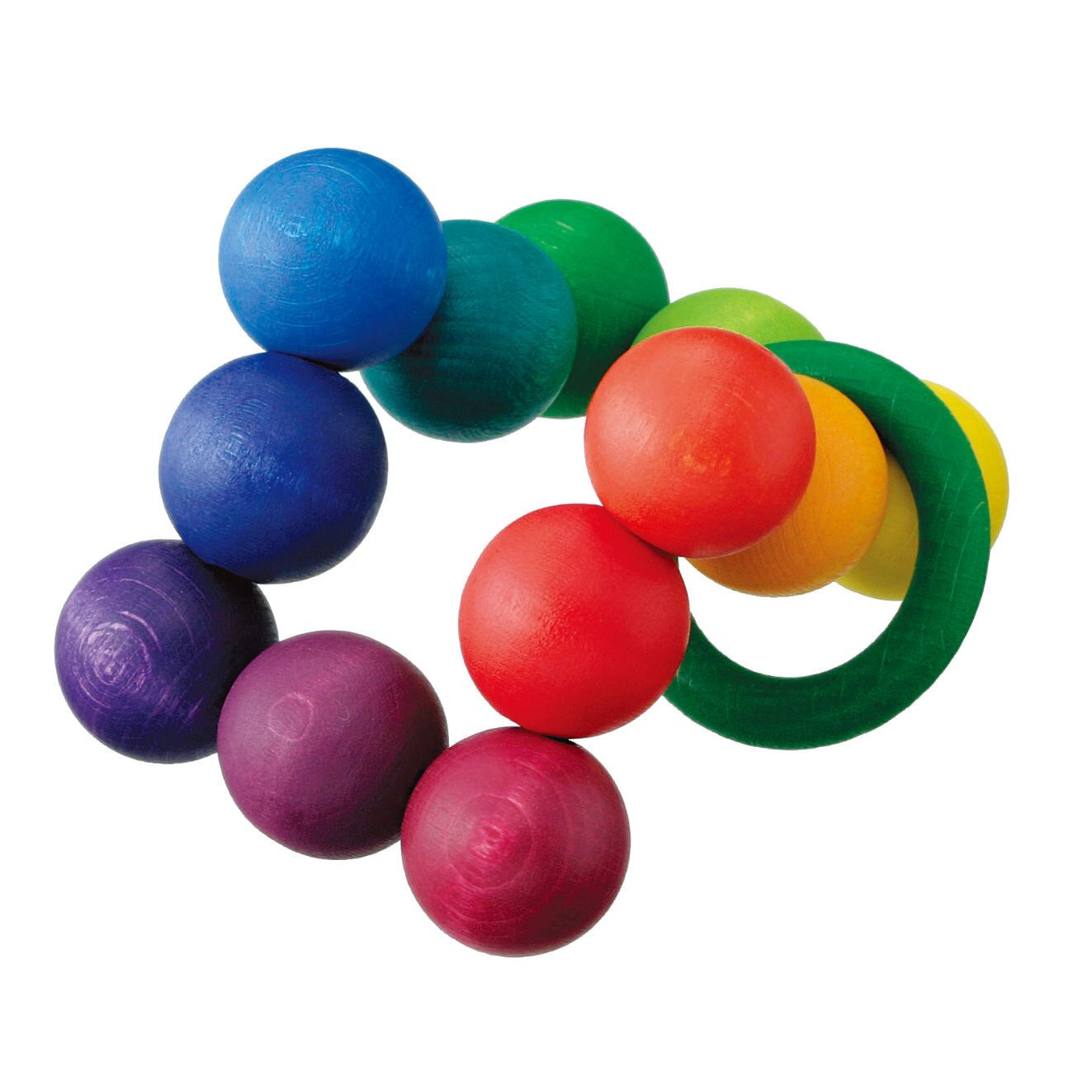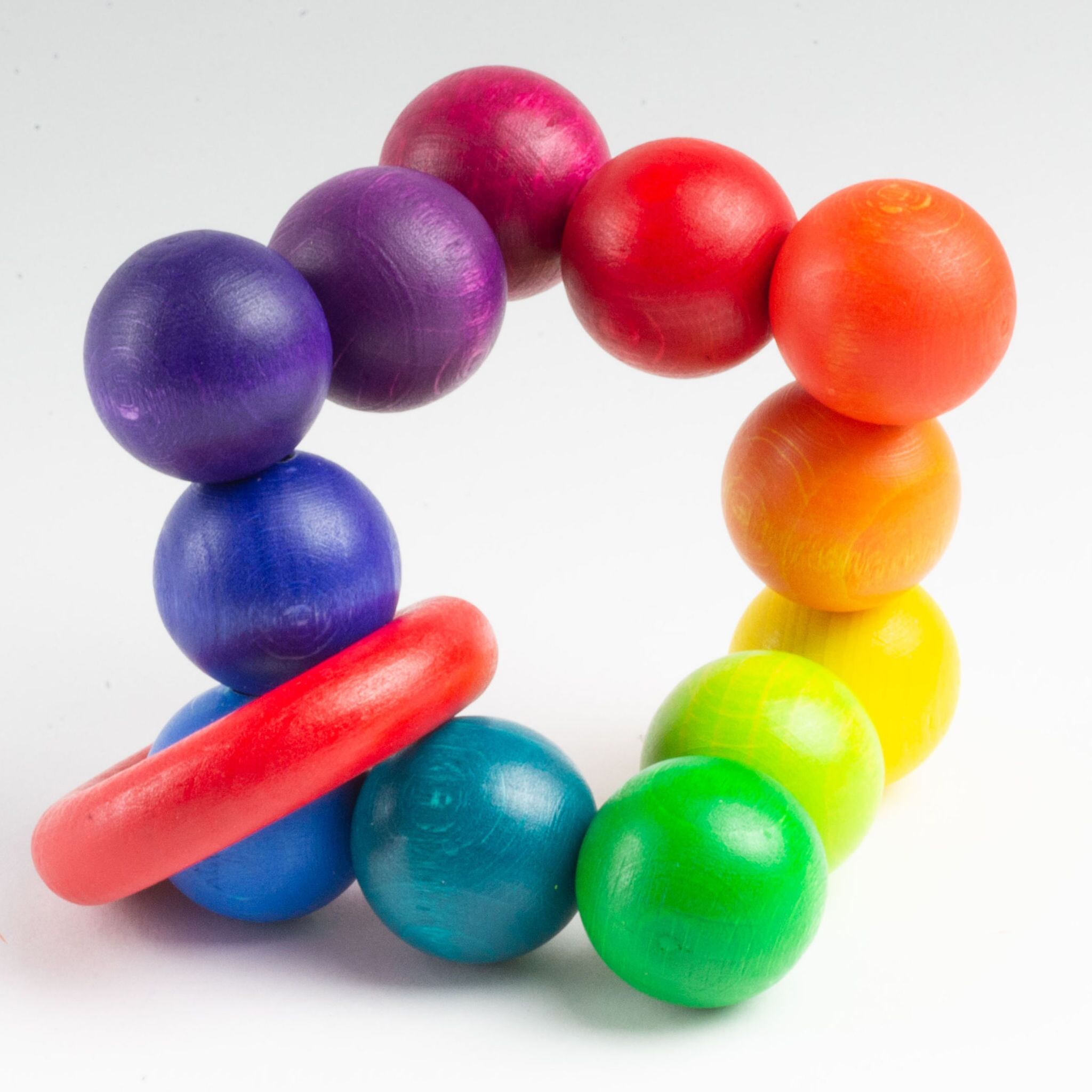・ベリデザイン社のベビーのための自信作。木玉がゴムでつながっておりさわると形が変わります。その形のアイディアとベリーカラーが魅力。「自分の手がうごく」ことに夢中の赤ちゃんにぜひ手渡したいおもちゃです。