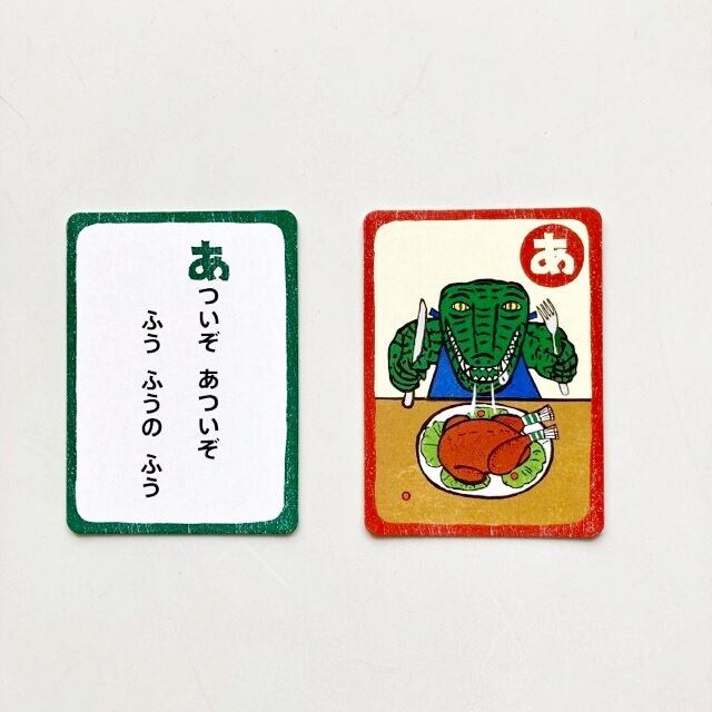 ・こども達が大好きな絵本「わにわに」のかるたです。絵本を読んだことがある人なら、「あ、あの場面!」と、うれしくなってしまうことでしょう。