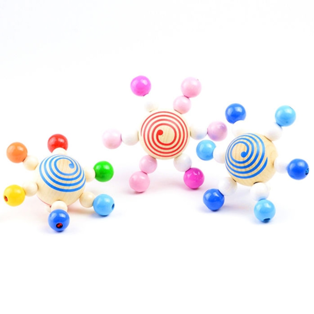 ・くるくるとよく回るコマです。ちょっと手が触れただけでも、回ってくれるので、その動きは子どもにとって新鮮でそして嬉しいもの。もちろん、手に持ってにぎにぎするのもいいですし、ビーズの部分はゴムでつながっているので、つまんだりさわるとぐにゃりと曲がるのも楽しいです。