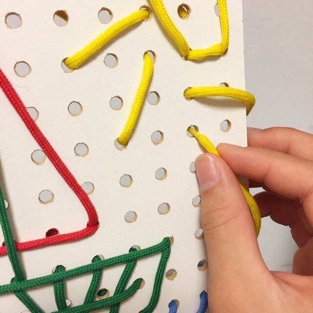 ・ひも通しも、ボードになると、ちょっぴり「縫う」の指使いに近くなります。2つ3つひもを通すと線ができる楽しさに気づき、ひもの色、渡し方をどんどん工夫したくなります。試行錯誤の末に出来上がった時の達成感はひとしおです。
