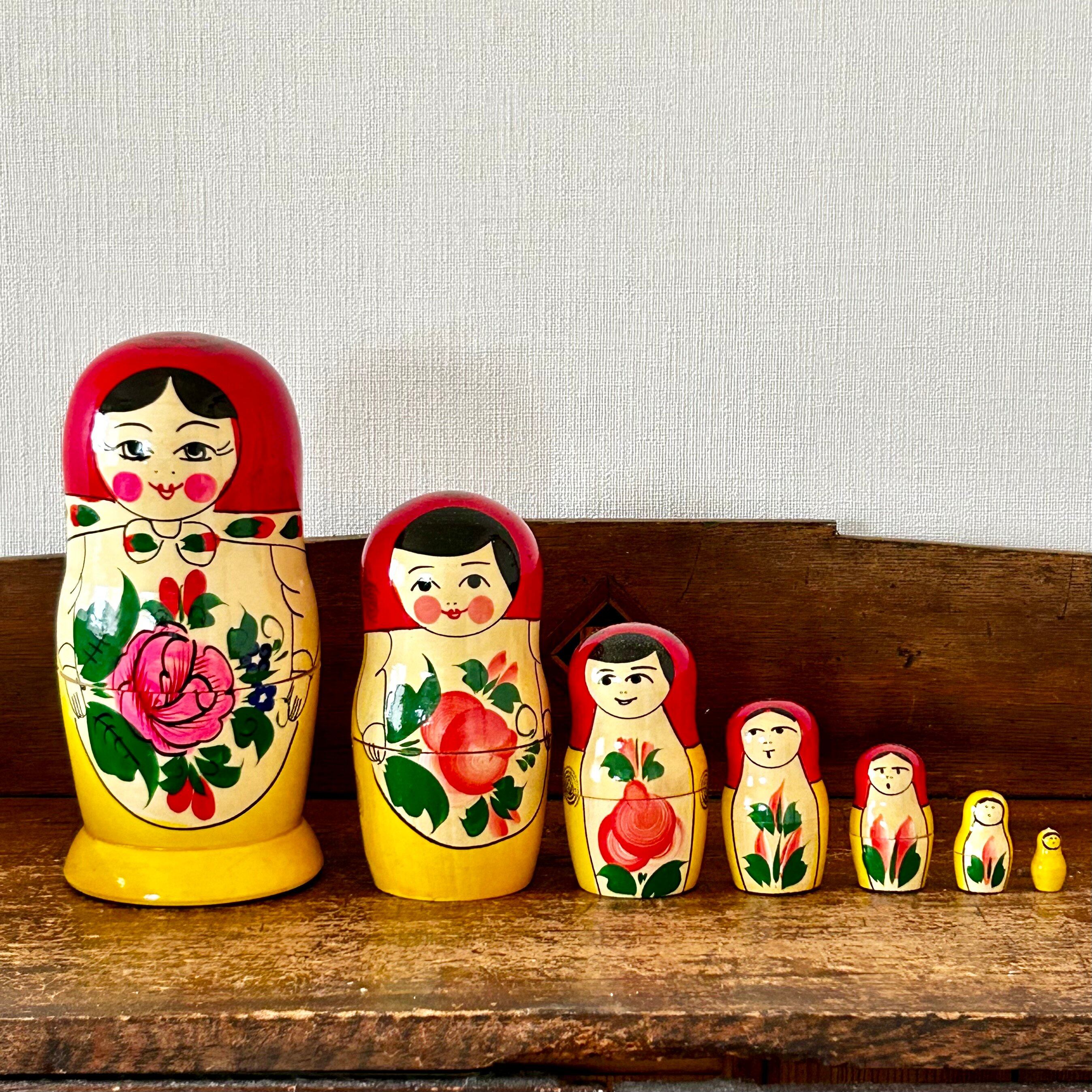 全体のなめらかな曲線、頭の表情などの点で日本のこけしのデザインや、だるまの入れ子(箱根細工<七福神>)のアイデアがとり入れられたと考えらえています。ロシアで作られるようになったのは1890年代で、モスクワの工房で制作されたのが最初のようです。※輸入元説明書より