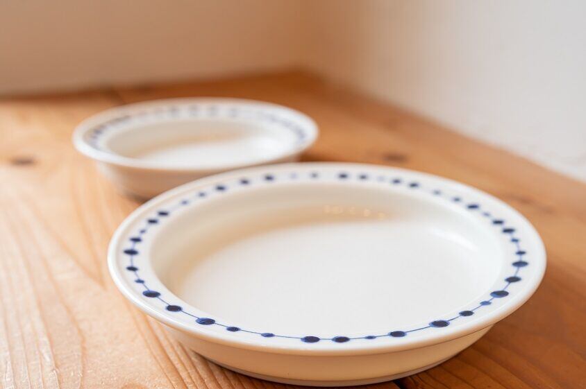 ・定番のユニバーサルプレートのふちにドット柄をあしらったデザインです。落ち着いた藍の色合いが食材を引き立てます。