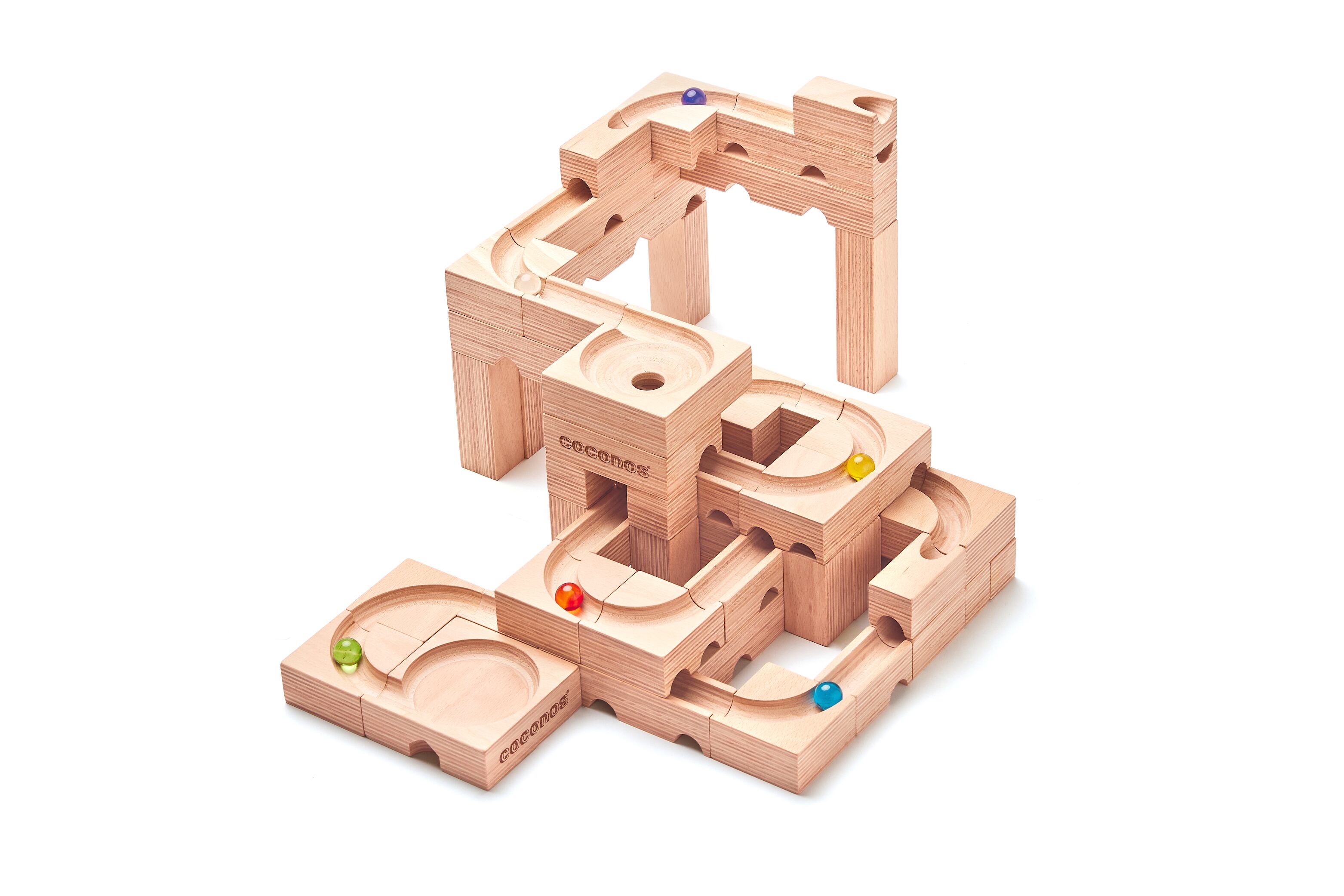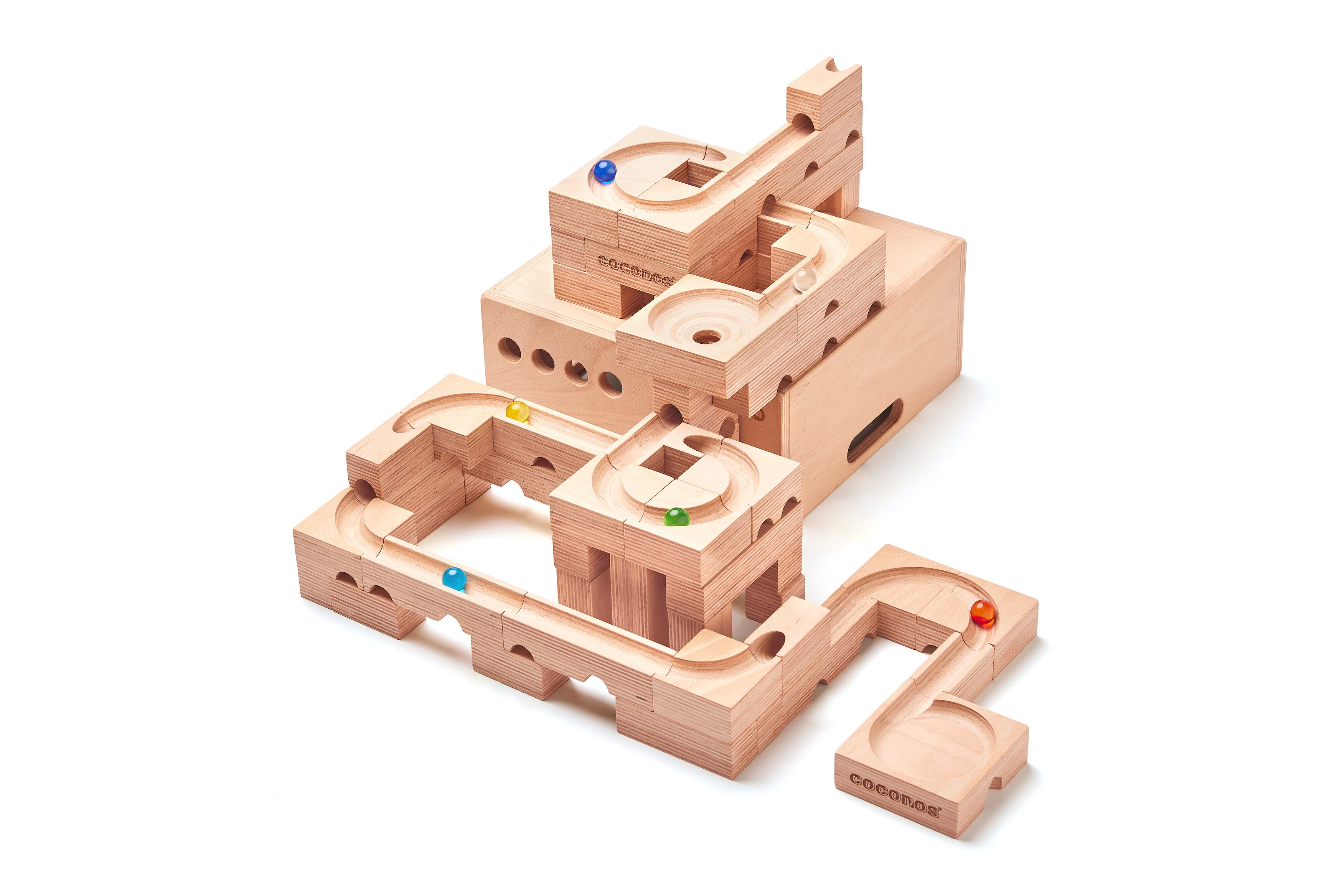 ・coconosは、ビー玉転がし・積み木・パズルを組み合わせたメイドインジャパンの木製玩具です。