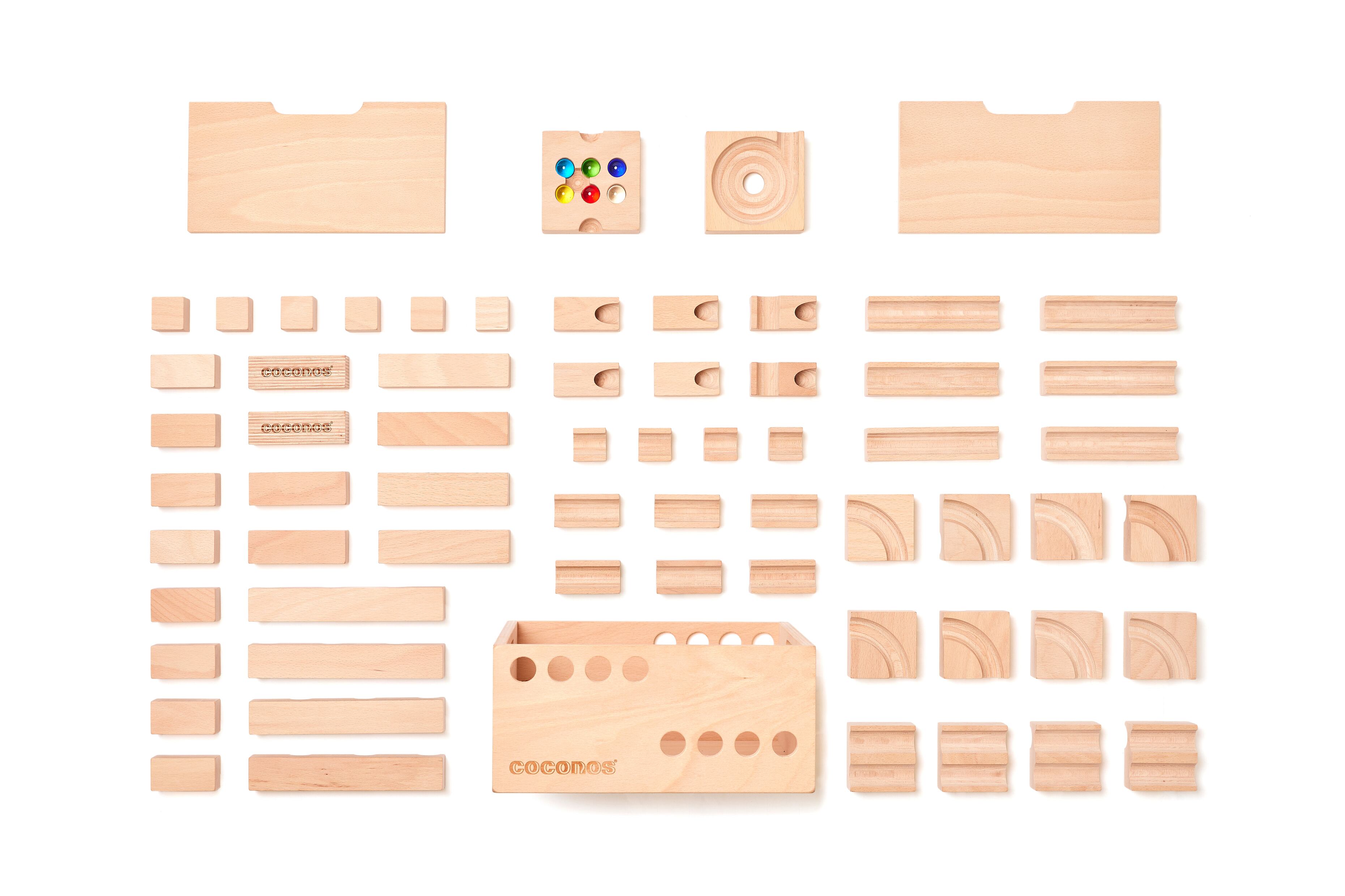 62ピースで構成されたcoconos3は、ココノスの奥深さをたっぷり楽しむことができる人気のセット。パーツを使いこなせば立体的で美しい道を作ることができ、木箱に収めて遊ぶ『片付けミッション』も楽しめます。大小さまざまなパーツが入っていて大人でも楽しめる内容量です。