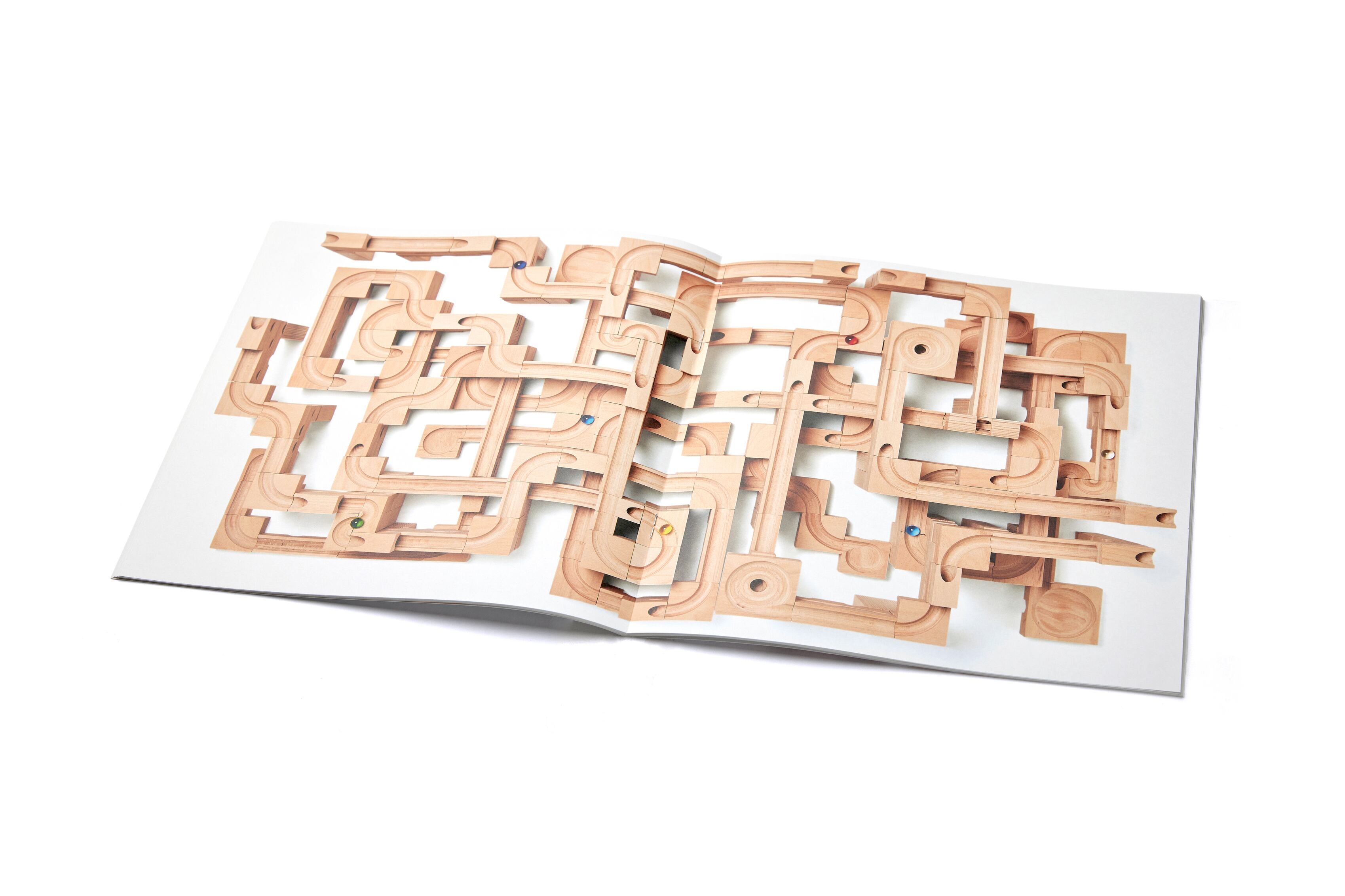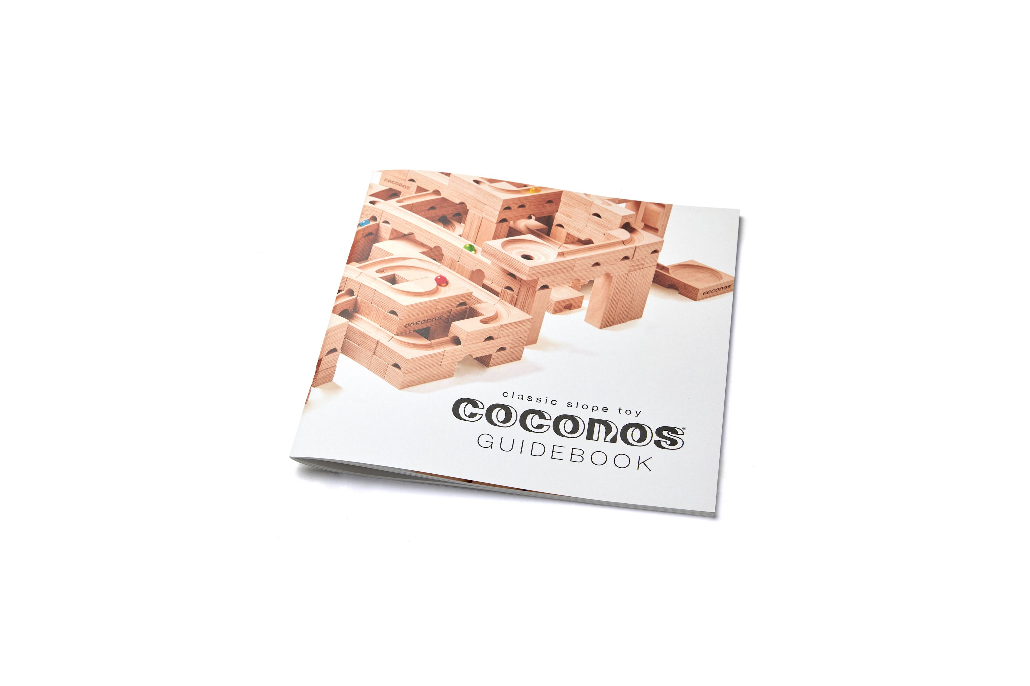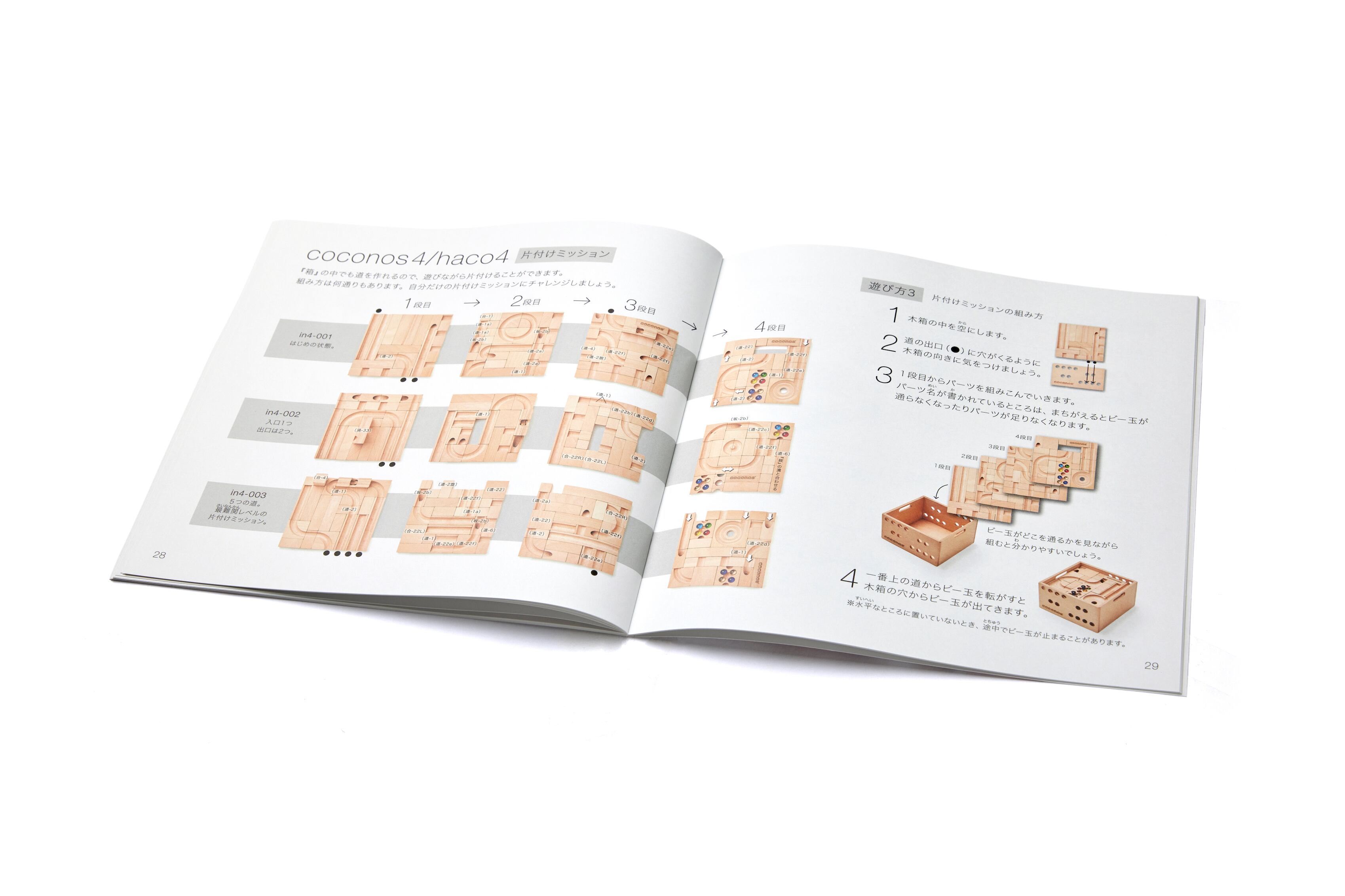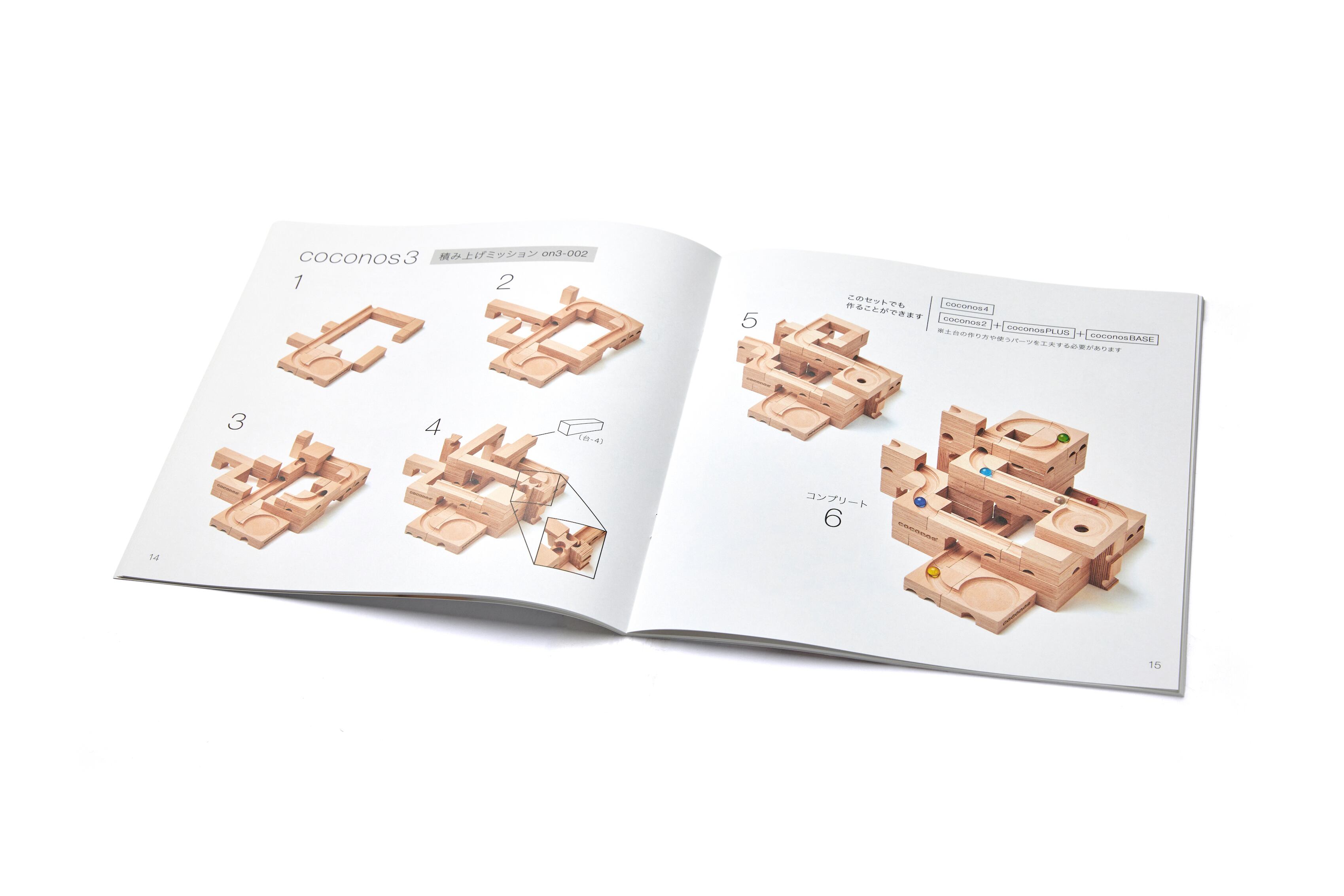 ココノスの遊び方は自由で無限大ですが、各パーツを組み合わせて道を作る『積み上げミッション』と、木箱の中にはめ込みながらビー玉の道を作る『片付けミッション』を、それぞれの基本セットで写真を用いて掲載しています。ココノスで遊ぶすべての人たちのチャレンジ意欲をかき立てるような一冊となっています。